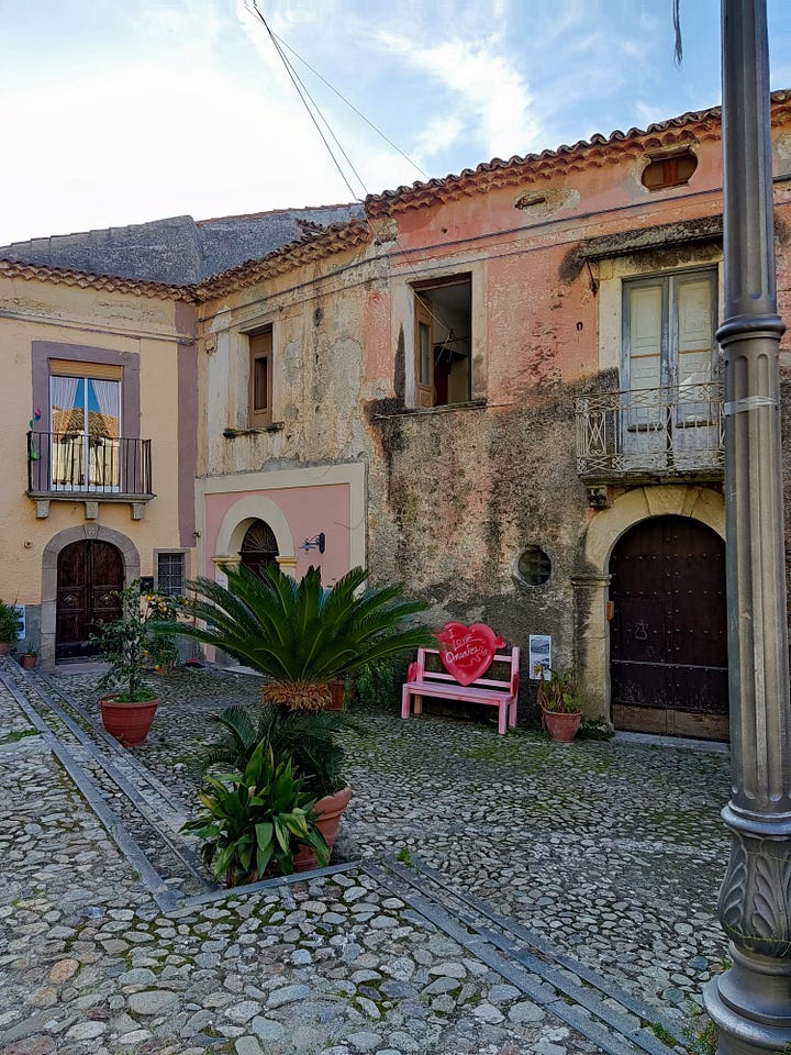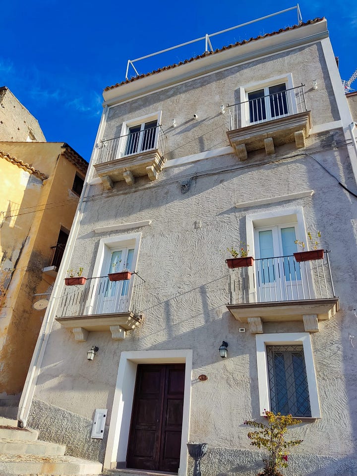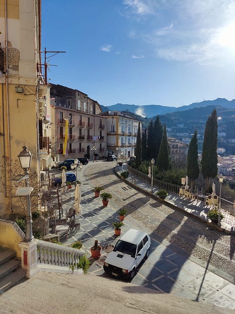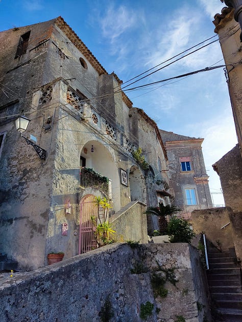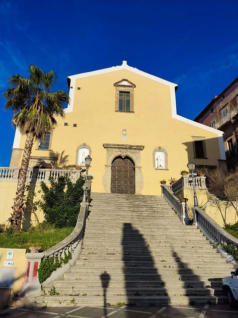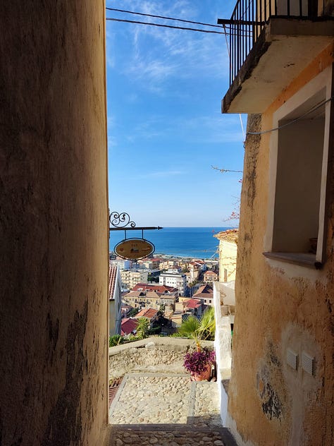 Creo saber qué pasó, les cuento. En questo paese, Amantea, el lunes es feriado comercial. Todos los comercios cierran y se descansa. Solo abren algunos cafés y pizzerías. Ese día me levanté con ganas de ir a caminar. A las ocho ya estaba en la calle. Subí a la parte vieja y visité por fuera la Chiesa Madre, que estuvo en remodelación por mucho tiempo y no se podía ver bien. A ella la bordean unas callejuelas angostas donde aún vive gente y me volví loca tomando fotos de las casas con vista al mar.